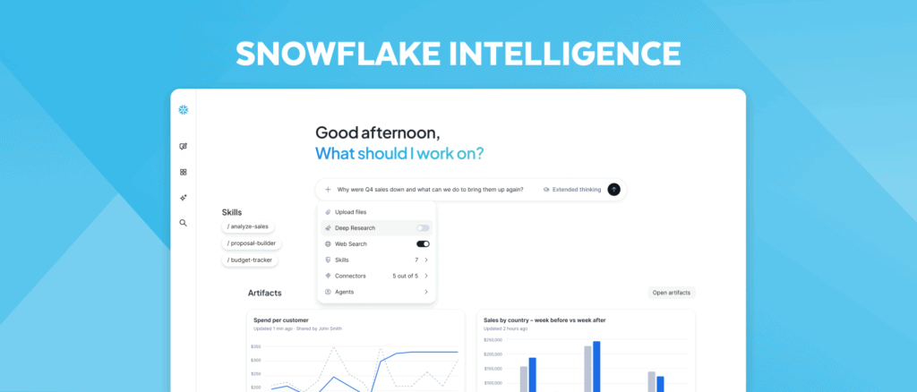 - Automate routine tasks: Skills (generally available soon) allow users to describe workflows in natural language — such as preparing presentations, conducting multi-step analysis, or sending follow-ups — and Snowflake Intelligence executes them automatically, eliminating manual work and making it easy to repeat and share.